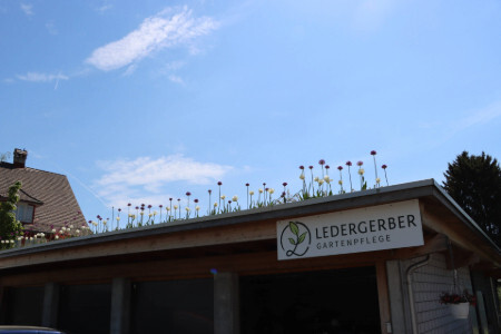 Bei diesem Neubau, wurde der Sitzplatz mit einem Stahlband eingefasst. Dadurch kann das umliegende Terrain auf der bestehenden Höhe verbleiben.